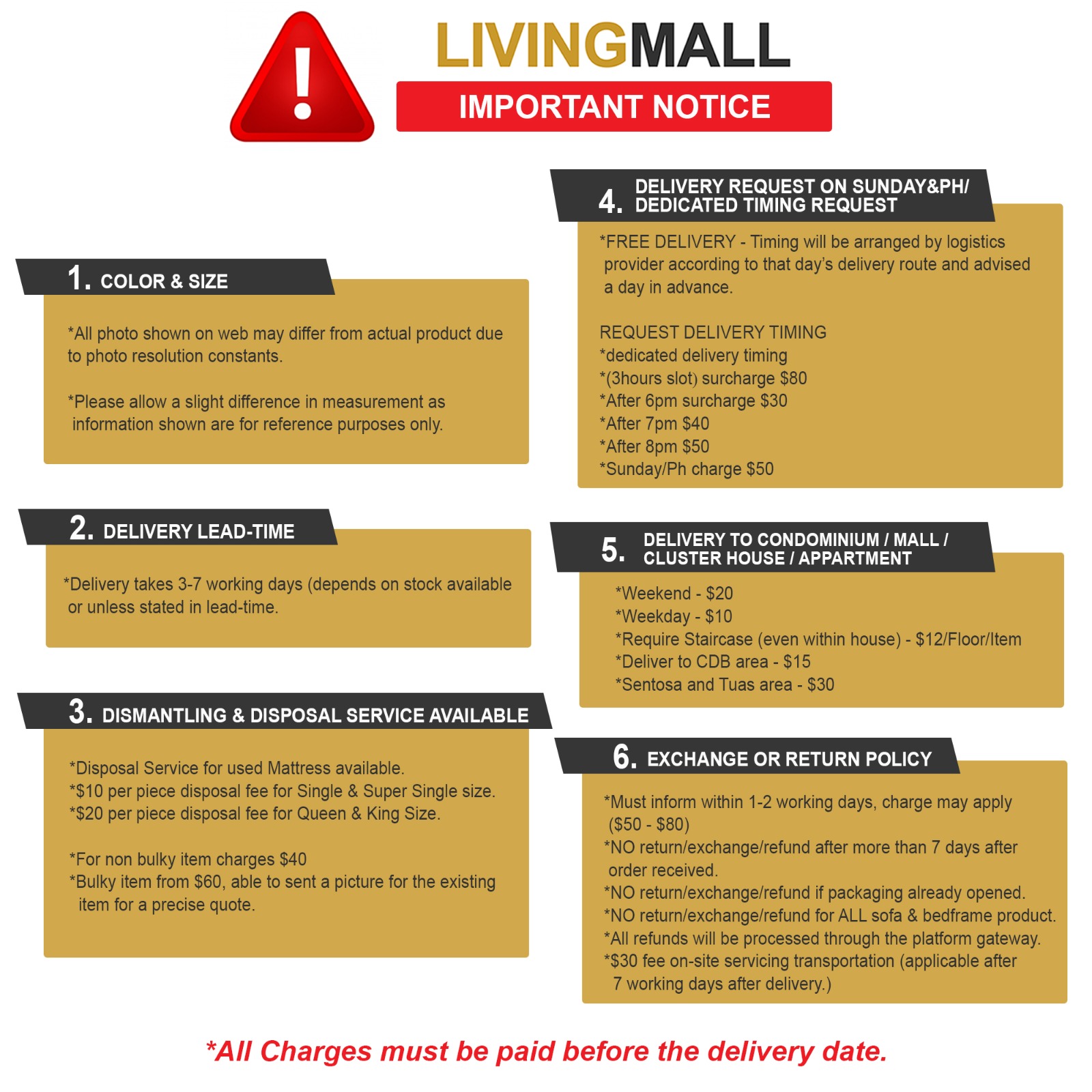 : Soft And Cushioned Armrest *Free Installation *Non-Lift Level Surcharge: Chargeable @ $12/floor/item *Additional Surcharge of $30 apply to Sentosa & Tuas Area *A Transportation fee of $30 per trip apply for any on-site servicing or exchange. *Free Delivery to HDB, other as listed (condo/mall/cluster house) surcharge $10 *Re-schedule of Delivery( if MISEED delivery) -$30 *Delivery Request on Sunday & PH - $50 (timing arranged by logistic provider) **Buyer shall examine all goods upon receipt and prior to installation. EXCHANGE, RETURN & REFUND are not allowed after installation. NO WARRANTY - Upon Delivery Pls inspect the item carefully Note: Actual product may vary from images due to photoshoot lighting conditions and screen settings. Or due to the use of natural materials (e.g. wood, marble, and leather grains).