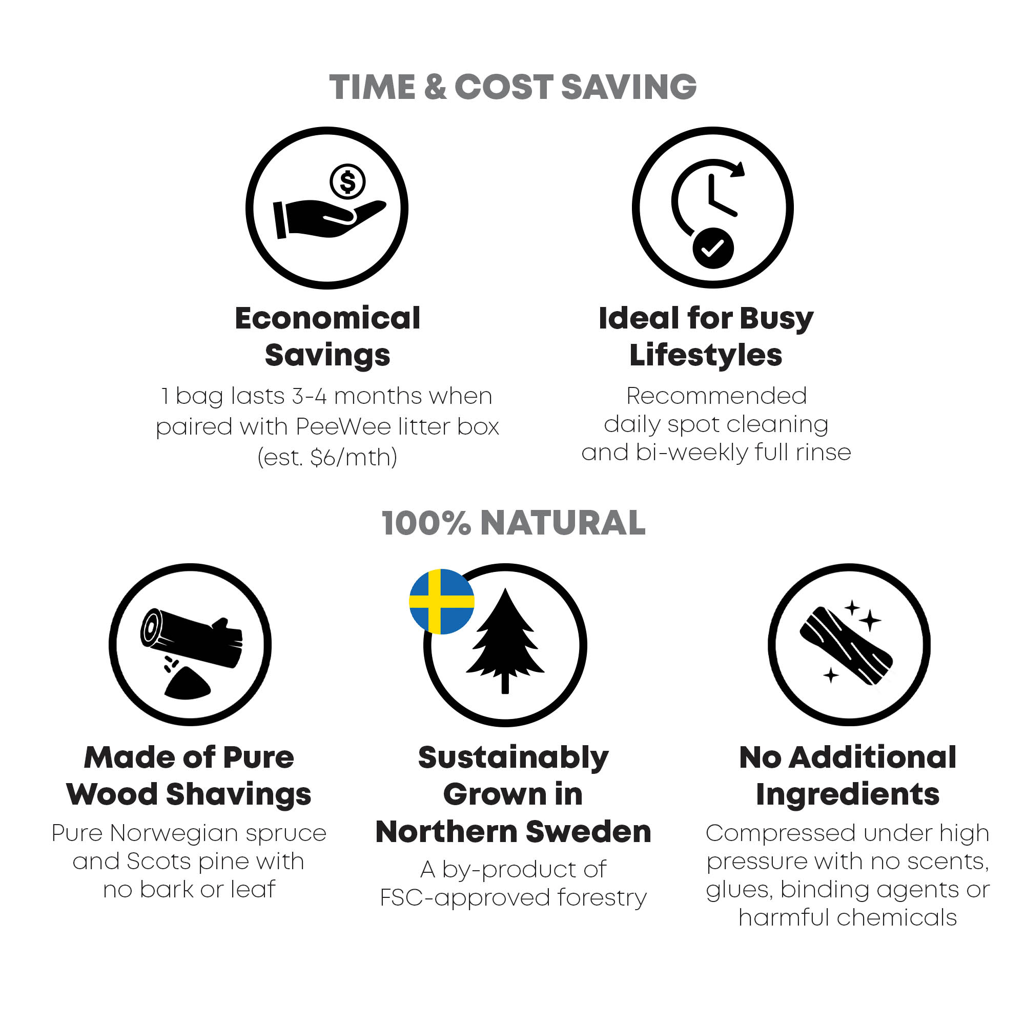 PeeWee wood pellets are safe for cats and people alike. The wood shavings are compressed into pellets in a unique process without the use of glue or any chemical additives. That makes PeeWee pellets 100% natural and 100% biodegradable. In addition, the pellets are impervious to mould and frost.