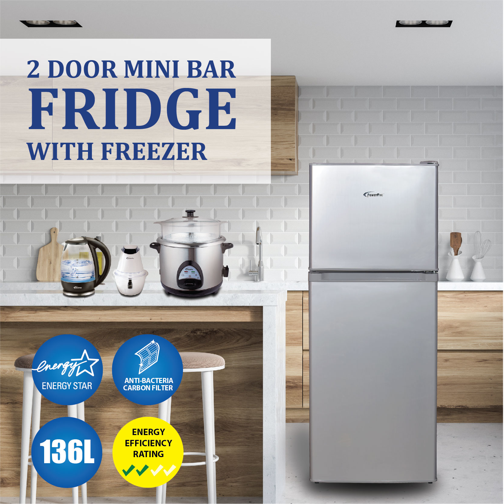 PowerPac 2 Door Mini Bar Fridge with Freezer 136L (PPF136)