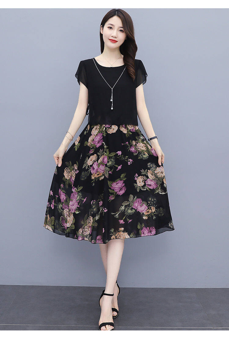 Large Size Belly-covering Fake Two-piece Dress Women's Summer New Style Slimming Mother Floral Chiffon Skirt