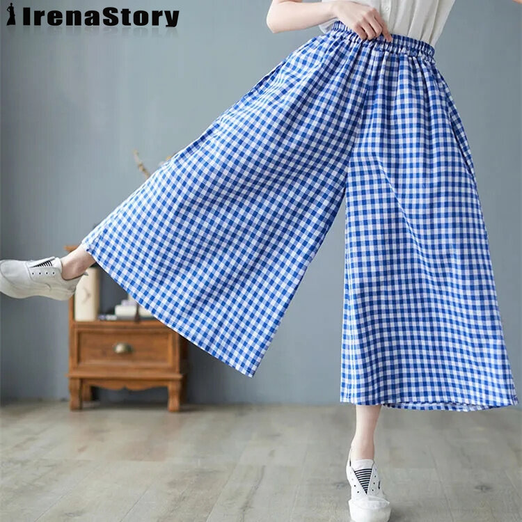 IRENASTORY Women's Culottes Fashion Casual Cotton Linen Plaid Wide Leg Pants Large Size Loose Comfortable Pants