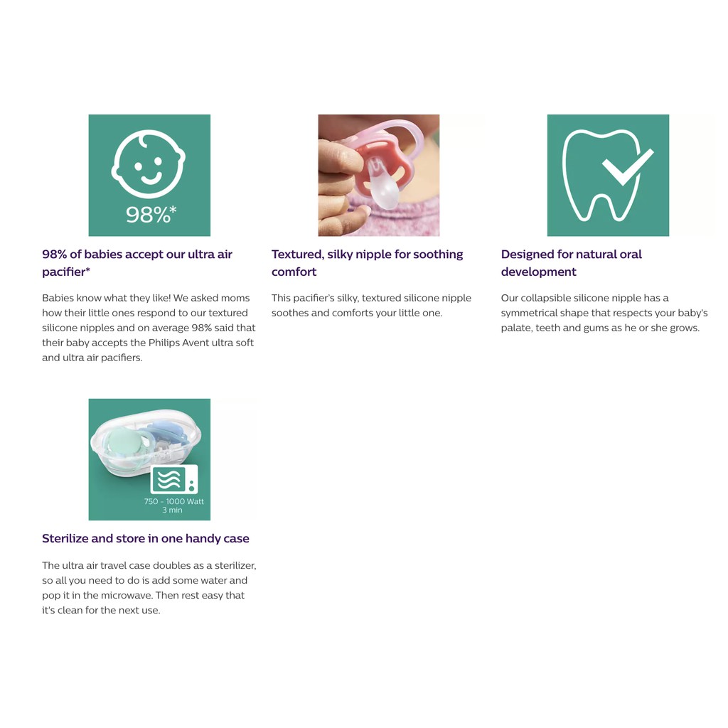 Soothe your baby with a pacifier that lets its skin breathe. The Philips Avent ultra air has extra large holes to keep skin dry. Its lightweight shield is designed for maximum air flow. Available in various colors and designs