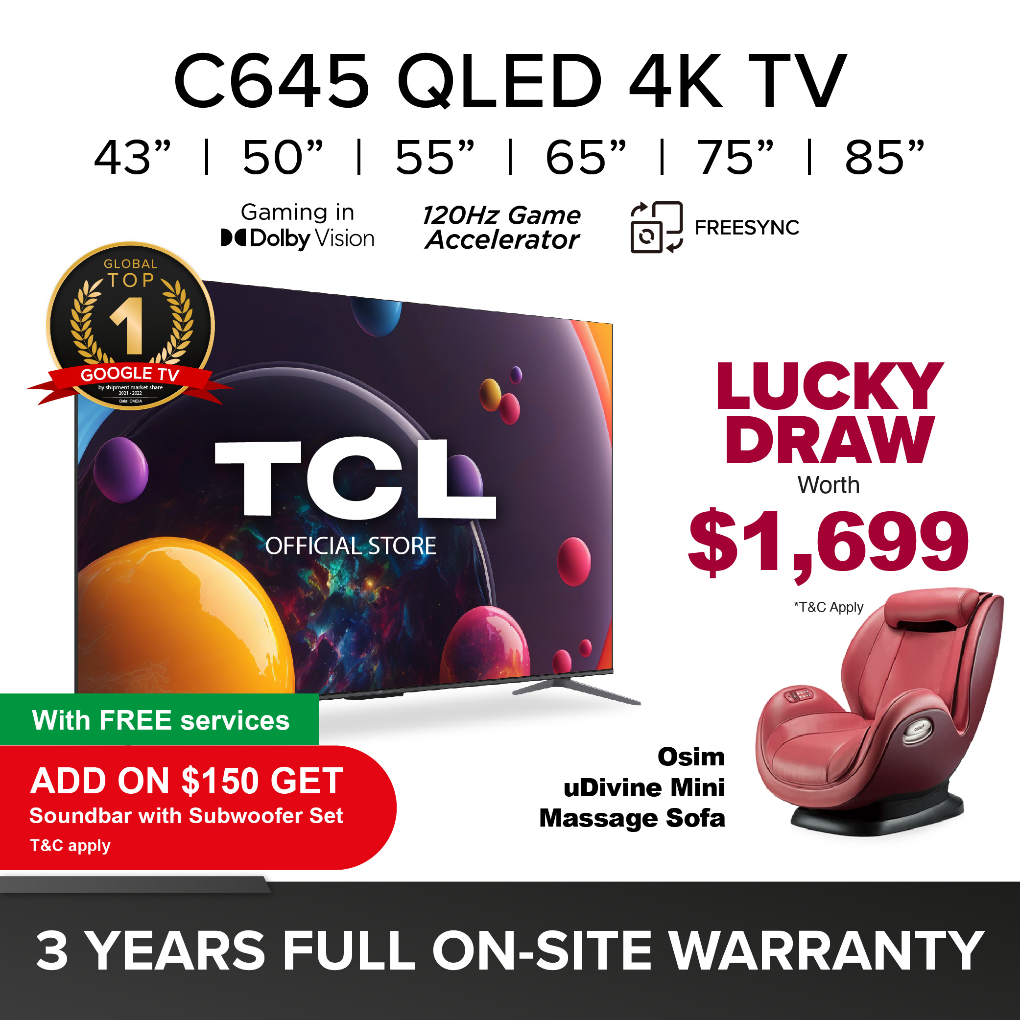 New | TCL C645 QLED 4K Google TV 43 50 55 65 75 85 inch | Wide Color Gamut | Dolby Vision Dolby Atmos | 120 Hz DLG | HDMI 2.1 | Google Duo
