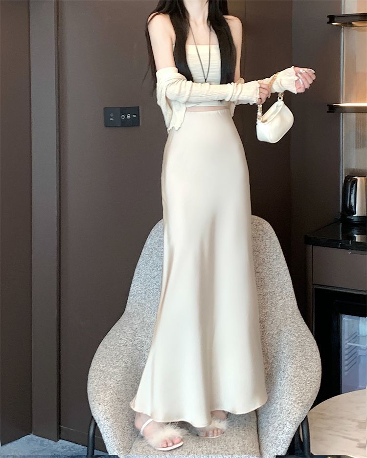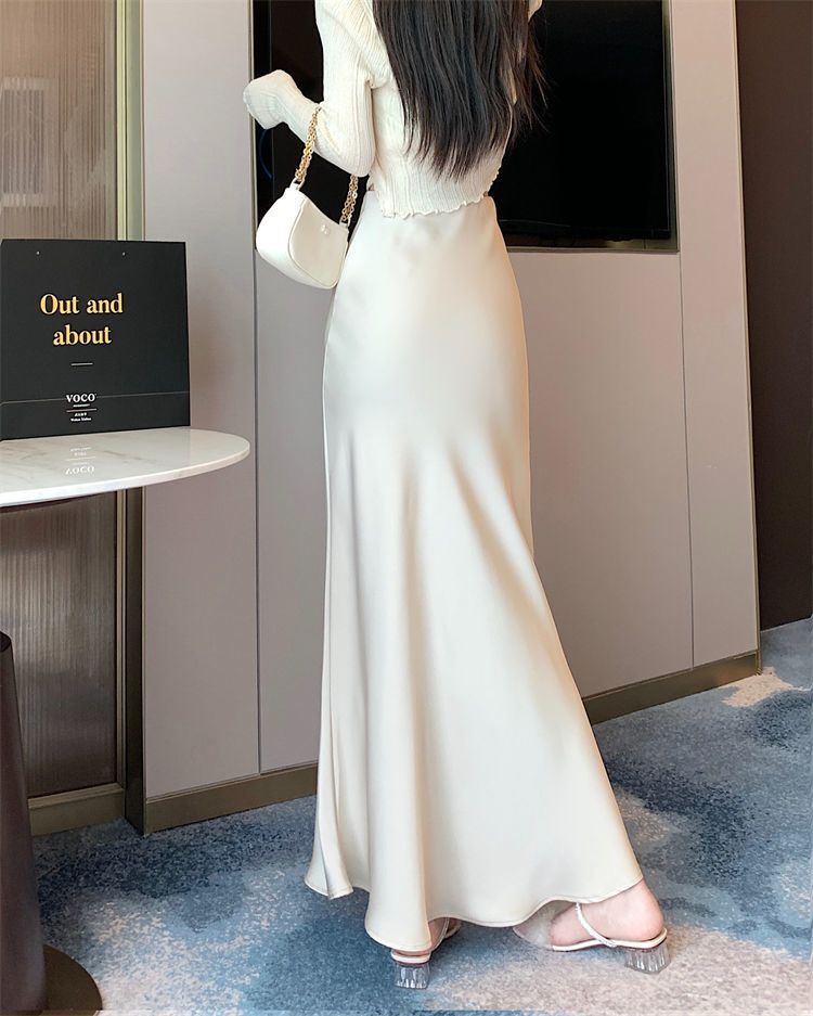 Ice Silk High Waisted Skirt for Women Korean Style A-line Wrap Buttocks Fishtail Long Skirt
