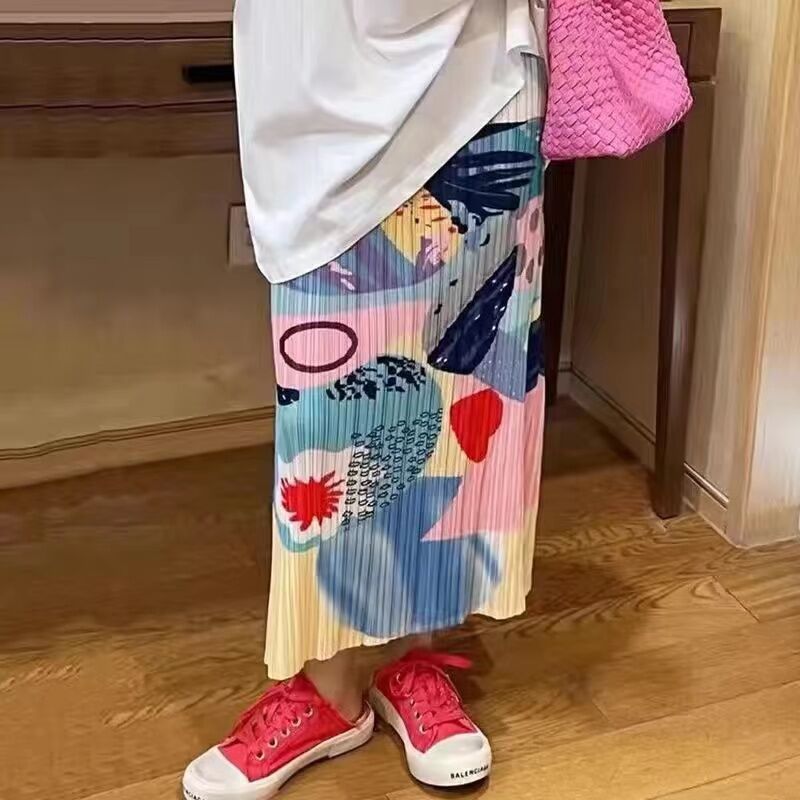 Pleated Skirt a-Line Slit Midi Skirt Women's Summer Thin High Waist Loose and Slimming Pleated Skirt Floral Skirt
