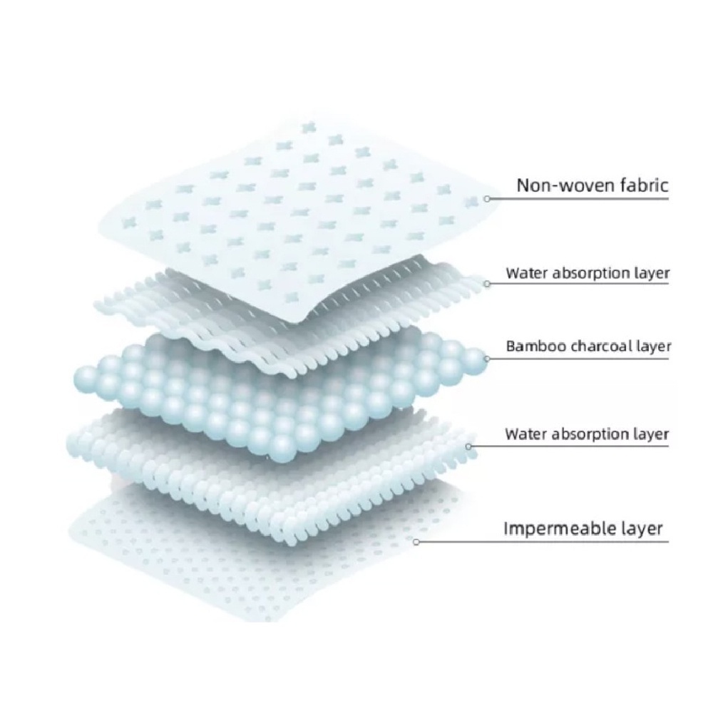 ✅ Third layer is a mix of super absorbent polymer and fluff pulp, forming the absorbent core that absorbs the urine and turns it into gel instantly