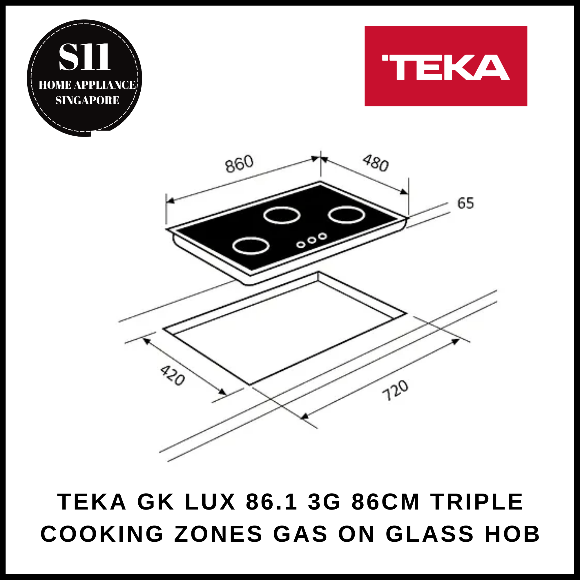 TEKA GK LUX 86.1 3G 86CM TRIPLE COOKING ZONES GAS ON GLASS HOB + 2 YEARS WARRANTY
