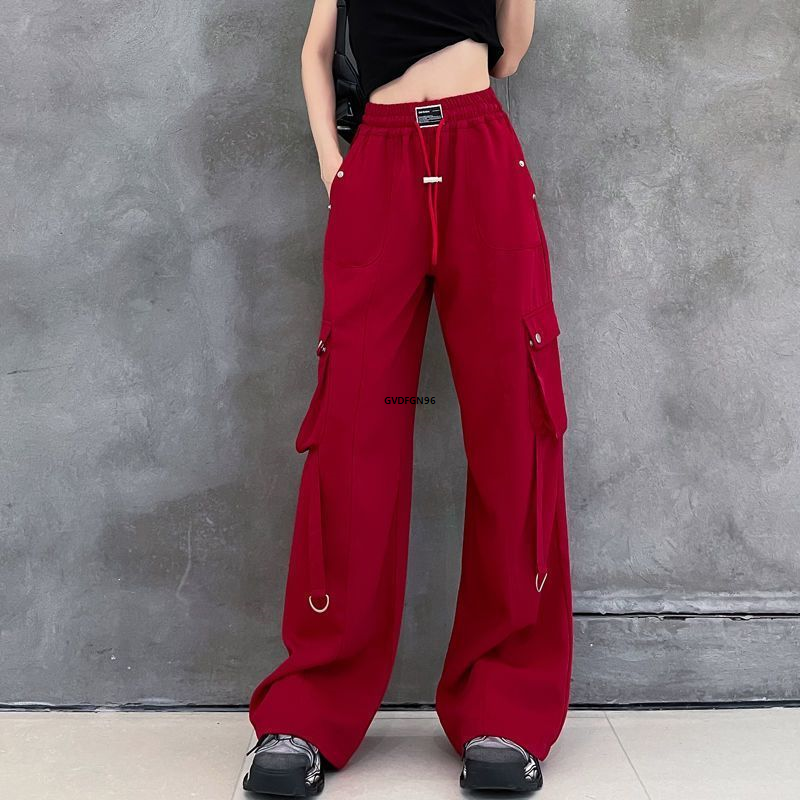 Wide-leg pants women's spring/summer new elastic waist personality straight leg slim pocket cargo pants trousers trousers women's pants