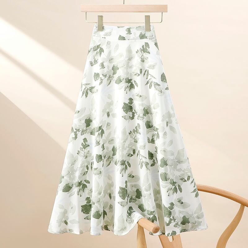 Summer K-style Easiest for Match High Waist Fat Cover Slimming Large Hem A- line Skirt French Retro Mid Length Long Length Floral Skirt