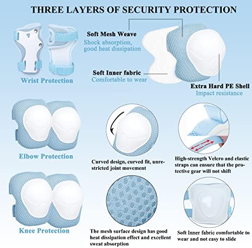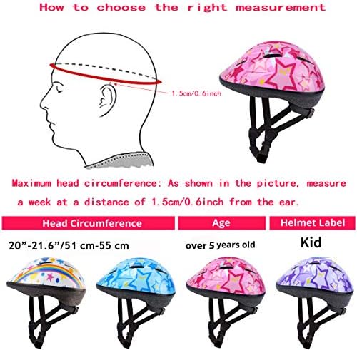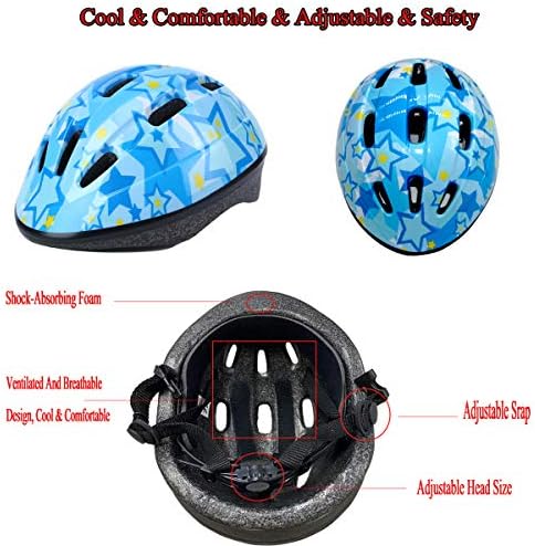 【Safety Impact Resistance】: Kids skateboard helmet adopt ABS outer shell and high-density EPS inner shell with thickened soft sponge inside, sturdy ABS shell resists impact, the EPS foam which helps absorb impact and protect the head during impact. Our goal is keep children away from injured when they are enjoying sports. 【Adjustable Design】: Kids skate helmet suitable for ages 3-8 years old boys and girls with helmet size 20”-21.6”/51 cm-55 cm. Toddler helmets come with an adjustable helmet turning knob and adjustable straps, can be flexibly adjusted to the size suitable for children. Helmet vents and foam keep kids cool, comfortable and reduce sweating when they during sport movement. 【Multifunctional Protective Sports Gear】: The kids bike helmet and knee pads elbow pads wrist guards are designed for kids sports safety protection, the tough pads with Velcro adjustable straps which can be flexibly adjusted to fit the child comfortable to wear. Protective gear set provides comprehensive safety protection for children. 【Suitable for Multiple Sports】: Our kids bicycle helmets can protect the safety of children, provide protection for many Outdoor Activities, such as bike riding cycling, roller skating, skateboard accessories, scooter, Street dance, pedal and more. 【Creative Gifts for Children】: Toddler helmet are very lightweight, and kids won’t feel tired after hours of wearing without sacrificing safety. The helmet is sturdy and durable that children can use it for a long time. It is a good choice as a gift for Children's Day, Christmas, Halloween, Thanksgiving, birthday and other festivals.