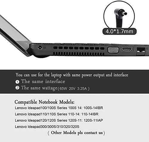 【Specifications】: Input: AC 100-240V-50/60Hz; Output: 20V-3.25A-65W (compatible with 20V 2.25A 45W).Connector size: 4.0 x 1.7mm Round Tip!Please check carefully your computer’s parameters!). 【Perfect replacement】: Adapter for Lenovo B450 B460 B470 B475 B560 B570 B570e B575 B575e G460 G460e G470 G475 G480 G485 E49 V470 V560 V570 4430 G560A G560e laptop Lenovo IdeaPad Y300 Y310 Y330 Y350 Y360 Y410 Y430 Y430a Y430g Y450 Y510 Y550 V570 U110 U350 G230 G430 G530 Z370 Z460 Z465 Z470 Z560 Z565 Z580 Z570 Z575 U310 U410 Notebook Power Supply. 【Compatibility】: Fit for Lenovo Flex 4 5 6 11 14 15 Flex 5-1470 5-1570 4-1470 4-1480 4-1570 4-1580 4-1435 4-1130 6-14IKB 6-11IGM 1470 1480 1570 1580 1435 1130 Flex-14 Flex-15 Flex 5-14ARE05 5-14IIL05 5-15IIL05, Ideapad 1 3 5 IdeaPad 3-14ADA05 3-14IIL05 3-14IML05 3-15IIL05 3-15IML05 3-17ADA05 3-17IML05 3 15ADA05 3-14ARE05 3-14IGL05 3-15ARE05 3-17ARE05 5-14IIL05 5-15IIL05 5-14ARE05 1-11IGL05 1-14IGL05, Fit for P/N: ADL45WCC ADL45WCA ADP-45DW B PA-1450-55LL. 【Compatibility110-14】: Fit for Lenovo IdeaPad 110-14IBR 110-14ISK 110-14AST 110-15: 110-15ISK 110-15IBR 110-15ACL 110-15AST 110-17: 110-17IKB 110-17ISK 110-17ACL 80UM 80VK 80VK003KUS 80UM0034US 110S-11: 110S-11IBR 80WG 80WG0001US IdeaPad 120S: 120S-11: 120S-11IAP 81A4 81A40025US 81A40025US IdeaPad 130: 130-14: 130-14IKB 130-15: 130-15IKB 130-15AST 81H5 81H6 81H7 Charger Power Supply Cord. 【Also Compatibility】: AC Adapter for Lenovo Ideapad 300/300S/310/320/320S/330/330S/500/500S/510/510S /520/520S/710S Series: 310-15ISK 310-15ABR 310-15IKB 310-15IAP / 320-14IKB 320-15ABR 320-15AST / 320S-14IKB 320S-15IKB / 330-14IKB 330-14AST / 330S-14IKB 330S-14AST / 510-15IKB 510-15ISK 510S-12ISK / 510S-13ISK 510S-13IKB 510S-14IKB 510S-14ISK 510S-14ISK / 520S-14IKB / 520-15IKB / 710S-13IKB 710S-13ISK etc. 【Customer First】: We completely consider from the customer's perspective! 12 Months warranty, 30 days money back guarantee ! 24 x 7 email supportl. If you have any questions, please feel free to contact us.Buyers are advised to purchase with confidence!