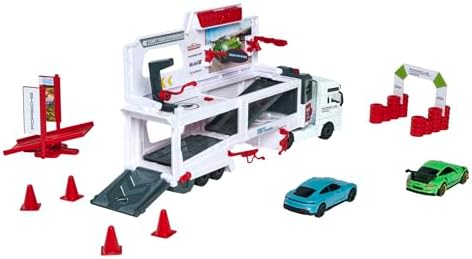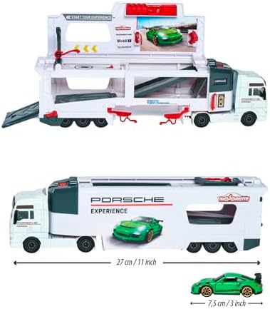 Majorette- Camión Porsche Experience 27cm, Incluye 2 Coches de Metal de 7,5cm, Partes Desplegables y Numerosos Accesorios, Adecuado A Partir de 3 Años, Color (212053304)