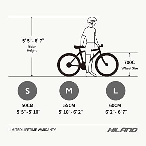 【Lightweight Frame】Hiland road bicycle is designed for people who like to ride or use it for daily commuting. The aluminium frame is lightweight, stiff, more durable and potential for higher speed, supports riders up to 330 pounds. 【Brake System】The brake system consists of double caliper brakes which are lighter ,easier to maintain and longer use time than disc brakes, gives you the stable and strong braking force and help you stop confidently in all conditions. 【Professional Drivetrain】Hiland road bike features 14 speed L-TWOO derailleurs and SHIMANO Shifters, gives diverse riding experience and also ensures total control in every situation, like in gravel, city road or other tough terrain. 【700C Tires】700c wheels have less rolling resistance, make riding more efficient, you can ride further and takes less energy. Wheels with large diameter have better rollover capability, more easily roll over potholes, bumps and other obstacles . 【Assembly&Size Guide】 Size S (50 cm) for women and men between 5'5" & 5'10",Size M (55 cm) for rider between 5'10" & 6'3", Size L (60 cm) for adult between 6'3" & 6'7". 85% pre-assembled, easy to assemble, free installation tools include.