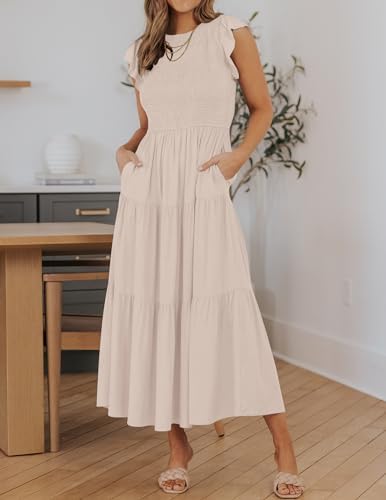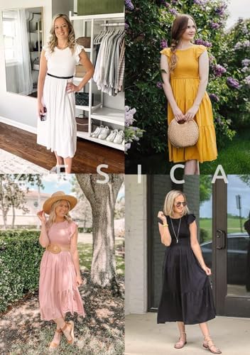 Size Guide: Small/US 4-6, Medium/US 8-10, Large/US 12-14, X-Large/US 16-18. Suggest to iron in low before wearing!! This bold and breezy midi dress has a flattering elastic shirred top, features a crew neck, solid color, high waist, short cap sleeves, edged with playful frills at shoulder, back key-hole closure and a flowy tiered midi skirt, adds more feminine. It's classy, cute and you'll love it. The smocked dress is all things sweet and everything you need! Either the flutter sleeves, ruched bodice or popping colours, will be non-stop talked about. Also can be wear as a maternity dress. This hot-days essential cottagecore dress is perfect for casual, daily, vacation, beach, holiday, wedding, office, family gathering, etc. Just style this with necklace, earrings, heels, wedges, matching clutch and a red lippy. Wash Instruction: Hand/Machine washable with cold water recommended, do not bleach, iron in low, hang or line to dry.