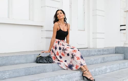 Kingfancy Women's Pleated Skirt Chiffon Elastic Waist A-Line Midi Length Skirt