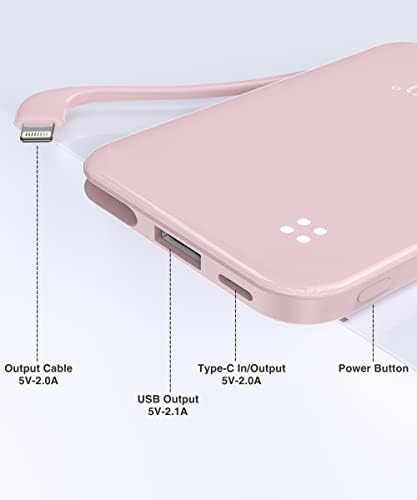 Portable Charger with Built in Cable: Perfect portable phone charger built-in cord compatible with your iPhone devices. Just plug into your phone for charging, there's no need to carry any extra cables. Pocket Friendly and Stylish Design: This battery bank charger covers with colorful Stylish Piano Lacquer (Black, white, pink, blue, red, green) for better visual beauty and hand feeling. Lightweight and compact design makes it easier to carry around in your pocket or bags. Three Way To Charge Your Devices: The portable battery charger is equipped with one usb type-c input&output and another usb output, as well as the built-in cord. Triple-output port design allows you to share this portable power bank with your families and friends. Daily Battery Backup: Ultra slim and credit card sized battery pack has a enough capacity of 4500mAh, which is suitable for daily use and short travel as a portable battery backup for your cell phones and other usb compatible smart devices. What's You Get: 1 * 4500mAh Portable Charger, 1 * USB Type-C Charging Cable, Worry-free 12-month warranty and friendly customer service.