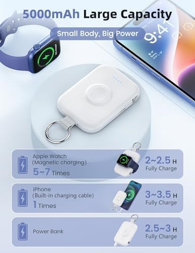 ⌚【Designed for Apple Watch/iPhone】Portable charger power bank designed for Apple Watch Series 9 / Ultra 2 / 8 / Ultra / 7 / 6 / SE / 5 / 4 / 3 / 2, portable charger for iPhone 15/14/13/12/11/Pro/Max and more. ?【5000mAh Large Capacity Battery Pack】This 5000mah Apple Watch and iPhone portable charger can charge your iWatch about 7~10 times,for iPhone 15 about 1 time,for AirPods about 6~8 times,takes only about 3 hours to fully charge the Power Bank. ?【Charge Multiple Devices Simultaneously】Portable charger power bank can charge Apple Watch,iPhone,Airpods and Android device Simultaneously. ?【Portable Travel Charger】Compact and lightweight keychain design, you can easily put this portable charger in your pocket or hang it on your backpack, which is a great travel companion. ?【Superior Safety Features】 Portable charger battery pack has built-in over temperature, over current, over voltage and short circuit protection to ensure you use the product safely.