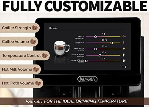 YOUR PERSONAL PROFESSIONAL BARISTA: Save yourself a lot of money by having your favorite Coffee done with an easy push of a button every day at home. This One-of-a-Kind Espresso Maker is designed with a range of 20 different Coffee Recipes, serving you with a glass of perfection every time! Easily choose from Lattes, Cappuccinos, Americanos, Espressos, Flat Whites, Macchiatos and many, many more! All exactly the way you want it! STRESS-FREE, HASSLE-FREE OPERATION: The Magia Super Automatic Espresso Machine is specially designed with a wide array of amazing functions and features, such as a 19-bar Italian Pump, Wide 7-inch High Resolution Touchscreen, 8.8oz Bean Storage Container, 1800ml water capacity tank, cup warmer plate and 18 preloaded special coffee recipes. A cup of delicious coffee has never been THIS simple! FULLY PERSONALIZED AND CUSTOMIZABLE: Built with the most sophisticated, revolutionary brewing technology money can buy. The high-tech software allows you to customize the amount of coffee, temperature, and hot milk foam settings laid out in a user-friendly interface and large 7-inch screen perfect for both beginners and experts. You can even save these settings in 10 personalized individual profiles for future use. Make your perfect coffee, your way, every time. BREW IT YOUR WAY: Choose how you want your coffee, strong or light! Put the coffee beans in the container and use the adjustment knob to set the conical burr grinder; turn the knob counterclockwise for fine powder and clockwise for coarse coffee grains. Set the coffee spout to fit a larger or smaller cup and use the single touch operation to brew two cups of coffee in one go. SUPER EASY-TO-CLEAN: The automatic espresso machine comes with conveniently designed with an auto-clean feature. This premium feature is designed to get rid of any residue from the brewer-unit or from the milk foam system, after every use or when the coffee machine turns off, turns on or is idle. Disassemble the drip tray, water tank and coffee waste bin and put them in the dishwasher or rinse them under running water every week. HASSLE-FREE, ZULAY SATISFACTION: We love and take pride in our Coffee Machine. If there are ever any issues, just contact us, and we will help you every step of the way. Chances are that this Coffee Maker will change your life. PROP 65 WARNING: This product may contain chemical(s) known to the State of California to cause cancer, birth defects and/or other reproductive harm.