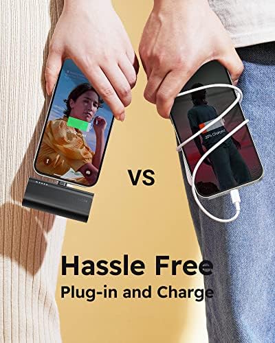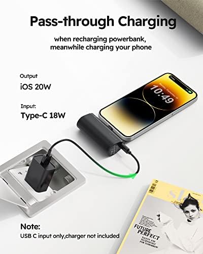 Design for All iPhones and AirPods: Portable iPhone charger is widely compatible with iPhone 13, iPhone 13 Pro, iPhone 13 Pro Max, iPhone 13 Mini, iPhone 12, iPhone 12 Pro, iPhone 12 Pro Max, iPhone 12 Mini, iPhone 11, iPhone 11 Pro, iPhone 11 Pro Max, iPhone XR, iPhone 8, iPhone 8 Plus, iPhone X, iPhone 7, iPhone 7 Plus, iPhone XS Max, iPhone XS, iPhone Se, iPhone 6s, and also other iPhones, AirPods and AirPods Pro etc. Quick Charge Recharging And Charging: Small portable charger for iphone, its USB C input supports QC 2. 0/ 3.0, FCP, AFC etc fast charging protocol (5V-2.0A, 9V-2.0A). Fully recharged only taking 1.5 hours by 9V-2A Quick recharging. Its output supports 20W PD, thus it can quick charge iPhone 8 and above iPhones series, will charge other iPhones at 5V normal charging speed. Cordless Portable Charger, Plug in and Power on for iPhone: If you are iPhones fans and are tired of carrying cables, this mini cordless portable charger is definitely best choice for you. Ultra small and ultra lightweight, dimensions is only 77.2*35.0*24.7mm (3.03''x1.38''x0.97''), only weigh 0.2lb, and no need cables again. Practical Pass-Through Features: Battery Pack supports pass through charging, when recharging power bank, it can charge your iPhones too by press the power button once. Portable phone charger supports Trickle-Charging mode, providing optimized charging for AirPods and AirPods Pro etc. Please refer to the manual to activate this Trickle-Charging mode. 5000mAh Portable Phone Chargers iPhone Battery Backup Charger: Power Bank is true 5000mAh (3.7V Battery), best emergecy portable charging source for iPhone or AirPod, normally charging around 0.8~1.5 charge for your iPhone.
