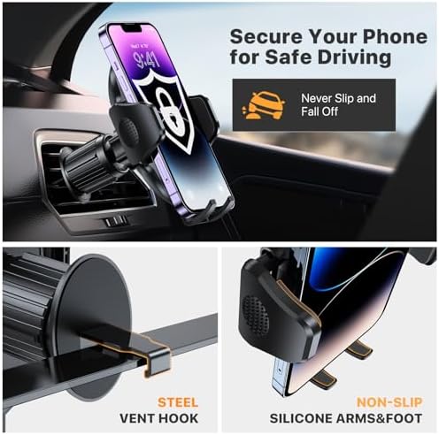 【Never Fall Off-Metal Hook Design】Miracase car phone holder adopts simplified locking design. The steel metal hook will catch one of car air vent blades and provide excellent strudiness. It will work well for your car even in extremely harsh environments 【One-hand Operation】With quick release button, adjustable clamp arms and foot, Miracase car phone mount makes it very easy to insert and remove your phone with single hand. Provide you with safer driving whether you are talking, navigating, listening to music or charging. 【Universal Compatibility】Miracase cell phone car mount is compatible with all phones (4.0-7.2 inches) and thicker cases. 【360° Flexible Rotation】The 360-degree rotatable design will provide you with the best viewing angle to keep secure driving. You can place your phone in any orientation (landscape, portrait and more), Just enjoy the best drving experience. 【 Professional Support】Please feel free to contact us for any product issues, a satisfying solution is promised forever.
