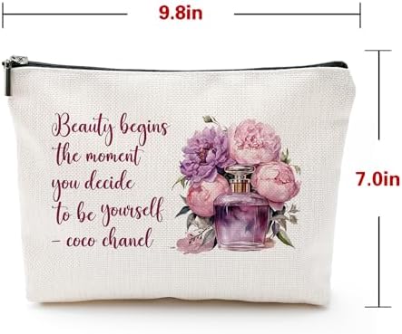 Coco Chanel Quotes Makeup Bag,Fashion Gift for Gilrs, Perfume Flower Beauty Begins The Moment You Decide To Be Yourself- Cosmetic Bag Waterproof Linen Toiletry Beauty Bag Travel Accessories Pouch