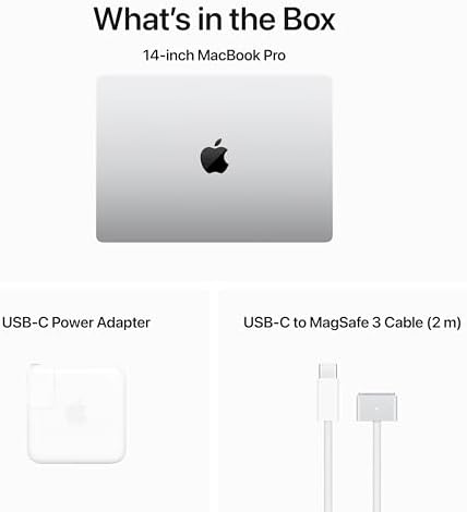 SUPERCHARGED BY M3 — With an 8-core CPU and 10-core GPU, the Apple M3 chip can help you blaze through everyday multitasking and take on pro projects like editing thousands of photos or 4K video. UP TO 22 HOURS OF BATTERY LIFE — Go all day thanks to the power-efficient design of Apple silicon. The MacBook Pro laptop delivers the same exceptional performance whether it’s running on battery or plugged in. (Battery life varies by use and configuration. See apple.com/batteries for more information.) BRILLIANT PRO DISPLAY — The 14.2-inch Liquid Retina XDR display features Extreme Dynamic Range, over 1000 nits of brightness for stunning HDR content, up to 600 nits of brightness for SDR content, and pro reference modes for doing your best work on the go. (The display has rounded corners at the top. When measured diagonally, the screen is 14.2 inches. Actual viewable area is less.) FULLY COMPATIBLE — All your pro apps run lightning fast — including Adobe Creative Cloud, Apple Xcode, Microsoft 365, Medivis SurgicalAR, and many of your favorite iPhone and iPad apps. And with macOS, work and play on your Mac are even more powerful. Elevate your presence on video calls. Access information in all-new ways. And discover even more ways to personalize your Mac. (Apps are available on the App Store.) ADVANCED CAMERA AND AUDIO — Look sharp and sound great with a 1080p FaceTime HD camera, a studio-quality three-mic array, and a six-speaker sound system with Spatial Audio. CONNECT IT ALL — This MacBook Pro features a MagSafe charging port, two Thunderbolt / USB 4 ports, an SDXC card slot, an HDMI port, and a headphone jack. Enjoy fast wireless connectivity with Wi-Fi 6E and Bluetooth 5.3. Supports one external display. (Wi‑Fi 6E available in countries and regions where supported.) MAGIC KEYBOARD WITH TOUCH ID — The backlit Magic Keyboard has a full-height function key row and Touch ID, which gives you a fast, easy, secure way to unlock your laptop and sign in to apps and sites.
