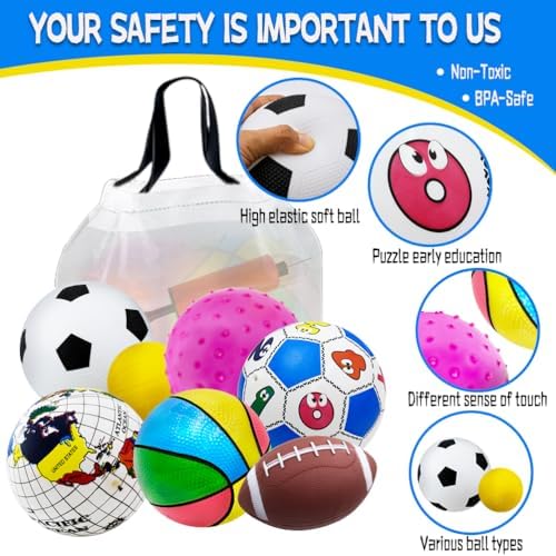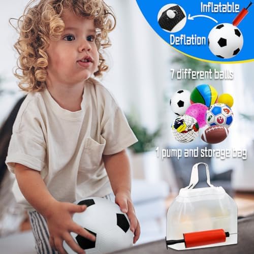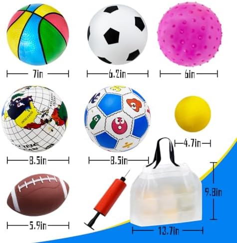 GREAT VALUE 7-PIECE SPORTS PUZZLE BALL SET! Comes with 1 pump(metal pin),Colorful Basketball (7in), Soccer Ball (6.2in), Football (5.9in), Thorn Ball (6in), Volleyball (4.7in), Earth Pattern Ball (8.5in), Number Soccer Ball (8.5in). Carefully put together set, the perfect for little hands to grip and play with for outdoor activities and the kids can enjoy a variety of games. FUN SPORTS BALL TOY: Our kids ball is soft and easy to hold and throw. Bright colors, different pattern balls, children can play tumbling, counting colors, games or put them in the ball pit. Attract children's attention and cultivate color recognition and hand and foot coordination. PLAY ANYTIME, SAFE: It has passed the official CPC safety certification and complies with toy safety requirements. Perfect for indoor and outdoor play,children will not be bored when traveling outdoors, perfect for practice and outdoor play - exercise learning, sports fun? Yes - have fun and love sports! Give your child a fun set of ball toys for kids. BEST GIFTS: Infants and toddlers are the golden period for babies to grow up!Don't let the children continue to be addicted to electronic products! Encourage a healthy and active lifestyle with the sports ball set.Promoting exercise from an early age can lead to a great body and a better life for your child by keeping them positive, brave and alive. Surprise your little ones on special occasions like birthdays or holidays. 100% SATISFACTION GUNARANTEED: You can rest assured that if for any reason you are not 100% satisfied, contact us immediately and we will refund your money no questions asked. Make you 100% satisfied and provide the best customer service!