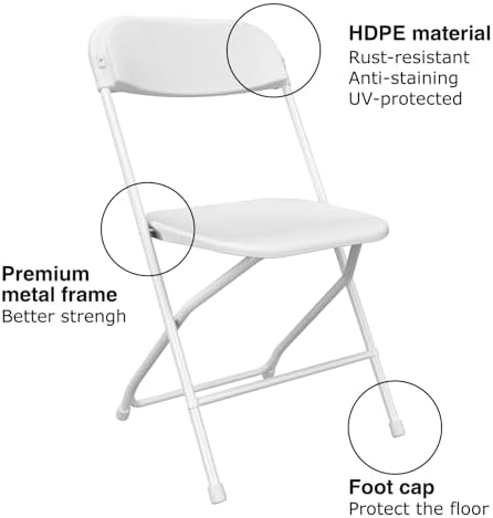 SET OF 10 FOLDING CHAIRS: Multipurpose 10-pack of white folding chairs are an indoor seating solution for banquets, gatherings, and dining - stylish, durable, and versatile. DESIGN FOR LONG-TERM USE: The seat and back are made of thick HDPE, environmental and enough thick. The strong frame is with white coated, beautiful as well as stable. Weight capacity 350lbs. This chair will complement any decor it's steel frame means it will remain durable for years of use. COMFORTABLE SEAT: Ergonomically designed folding chairs can give your back strong support and relief spinal pressure. ANTISKID RUBBER FEET: Rubber feet keeps floor from damaging and help to keep the seat in place while minimizing scuffing. Our plastic folding chairs is quite suitable for your workstation to entertain your guests, which is also a good choice for parties and events in order to treat a large number of people. PORTABLE LIGHTWEIGHT CHAIRS: No assemble needed, simply fold and unfold. Easy to open and close with seconds.They can be easily folded and stored away when not in use, saving you valuable space.