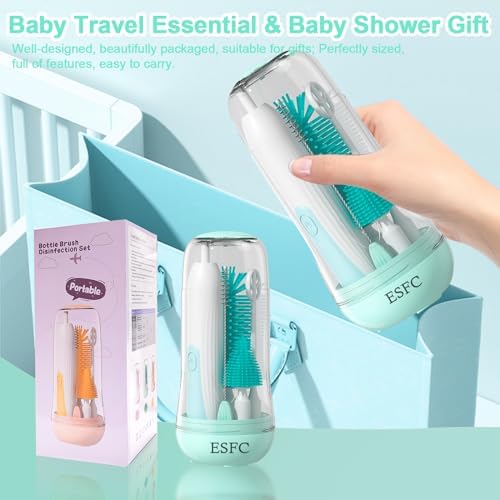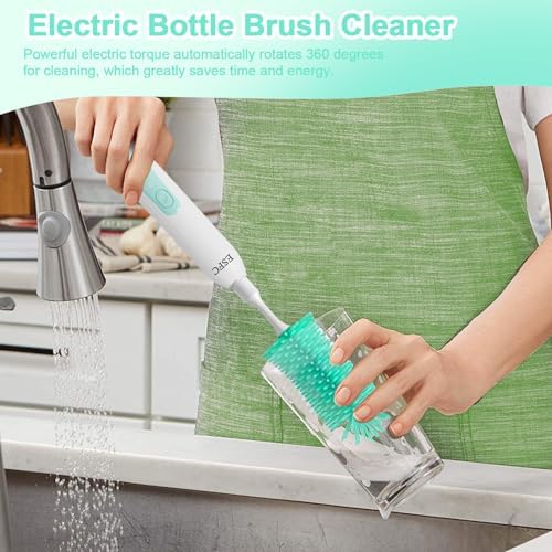 ESFC Portable Electric Baby Bottle Brush Set with Electric Bottle Brush,Nipple/Straw Brush,Milk Frother and Drying Base,Waterproof IPX7,Rechargeable Travel Bottle Cleaning Kit,Green